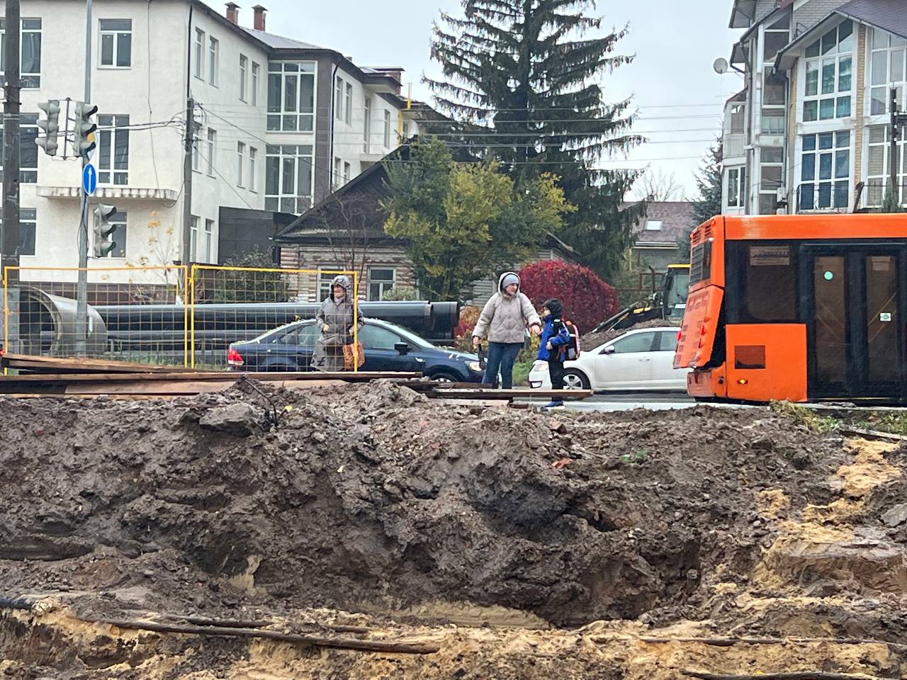 Остановочный павильон демонтировали ещё летом, а сейчас автобусы останавливаются и высаживают людей на узкое пространство тротуара, которое со всех сторон огорожено временным строительным забором. Люди вынуждены выходить на проезжую часть. В час пик на дороге оказываются десятки людей. Те, кто хочет пройти к своим домам более безопасно, идут по грязи прямо через строительство.